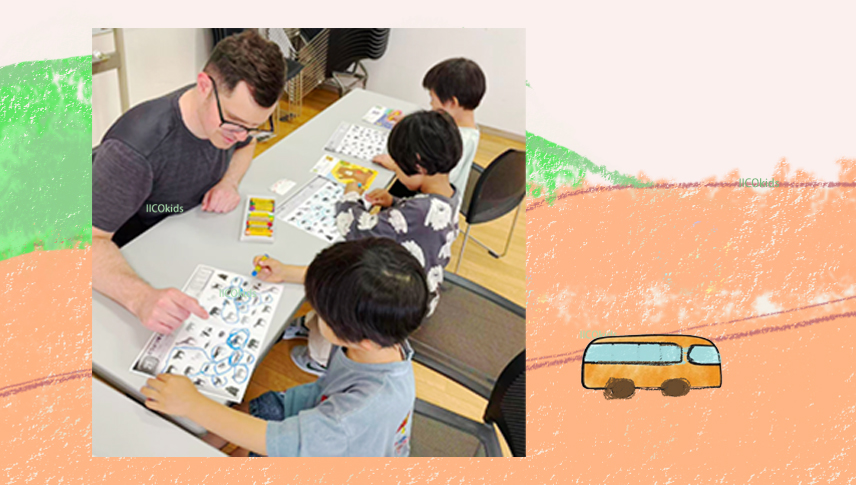 IICOkidsの英語Mason先生と一緒に取り組んでいる様子は、写真でご紹介しています
