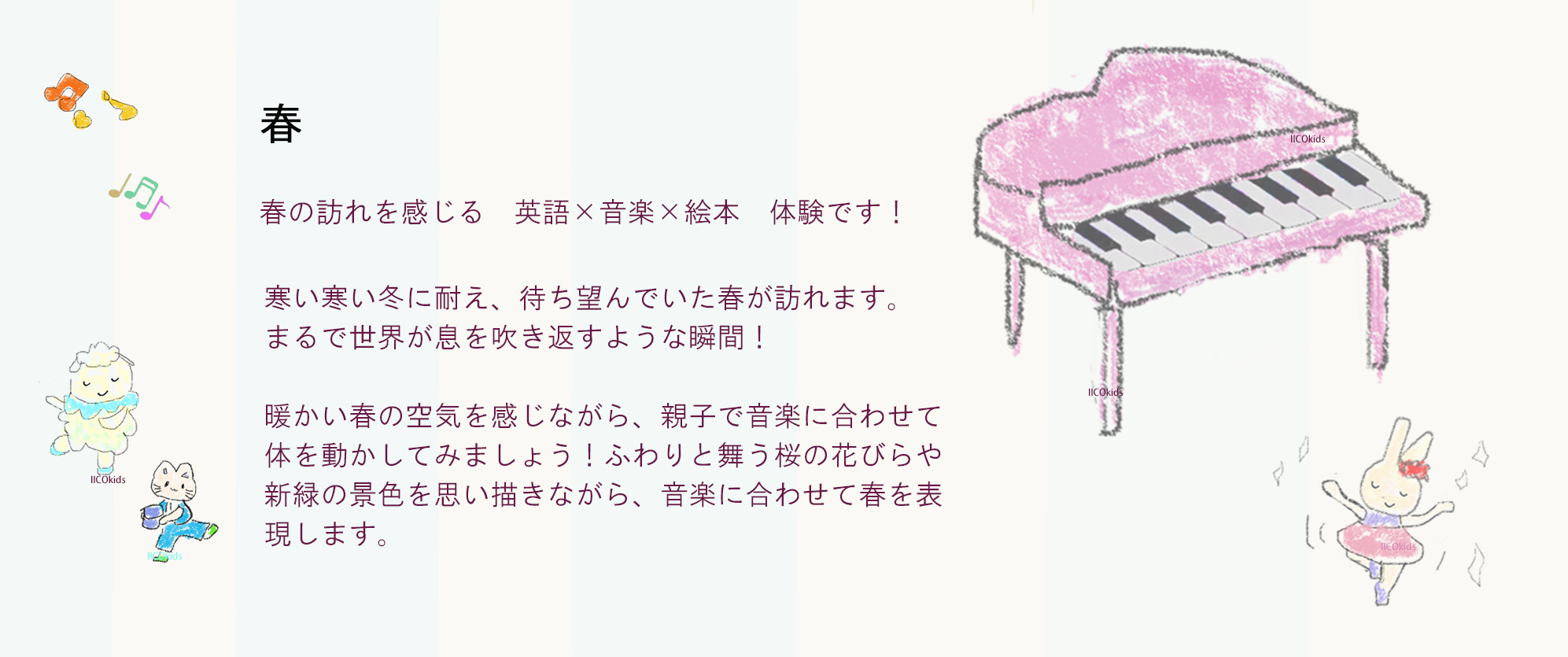 音楽and絵本で 楽しむ英語リトミックコース (4歳~小学生) | 第三日曜日 10時00分~10時35分 親子分離 | 10時00分~10時35分 月1回1,950円/人 |